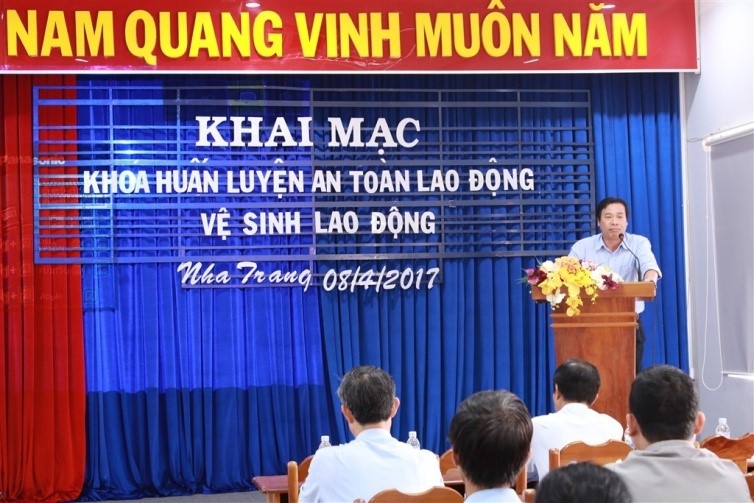 | (Ông Nguyễn Văn Đàm – Chủ tịch HĐQT đã phát biểu khai mạc lớp học và chỉ đạo các đơn vị, phòng ban, xí nghiệp luôn quan tâm, chú trọng đến công tác an toàn lao động, vệ sinh lao động và phòng chống cháy nổ trong quá trình làm việc và lao động.) |