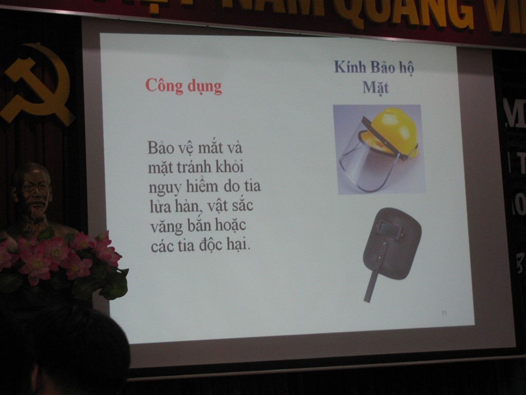 | Hướng dẫn CN trực tiếp sử dụng các dụng cụ, thiết bị bảo vệ mắt, đầu và các bộ phân cơ thể. |