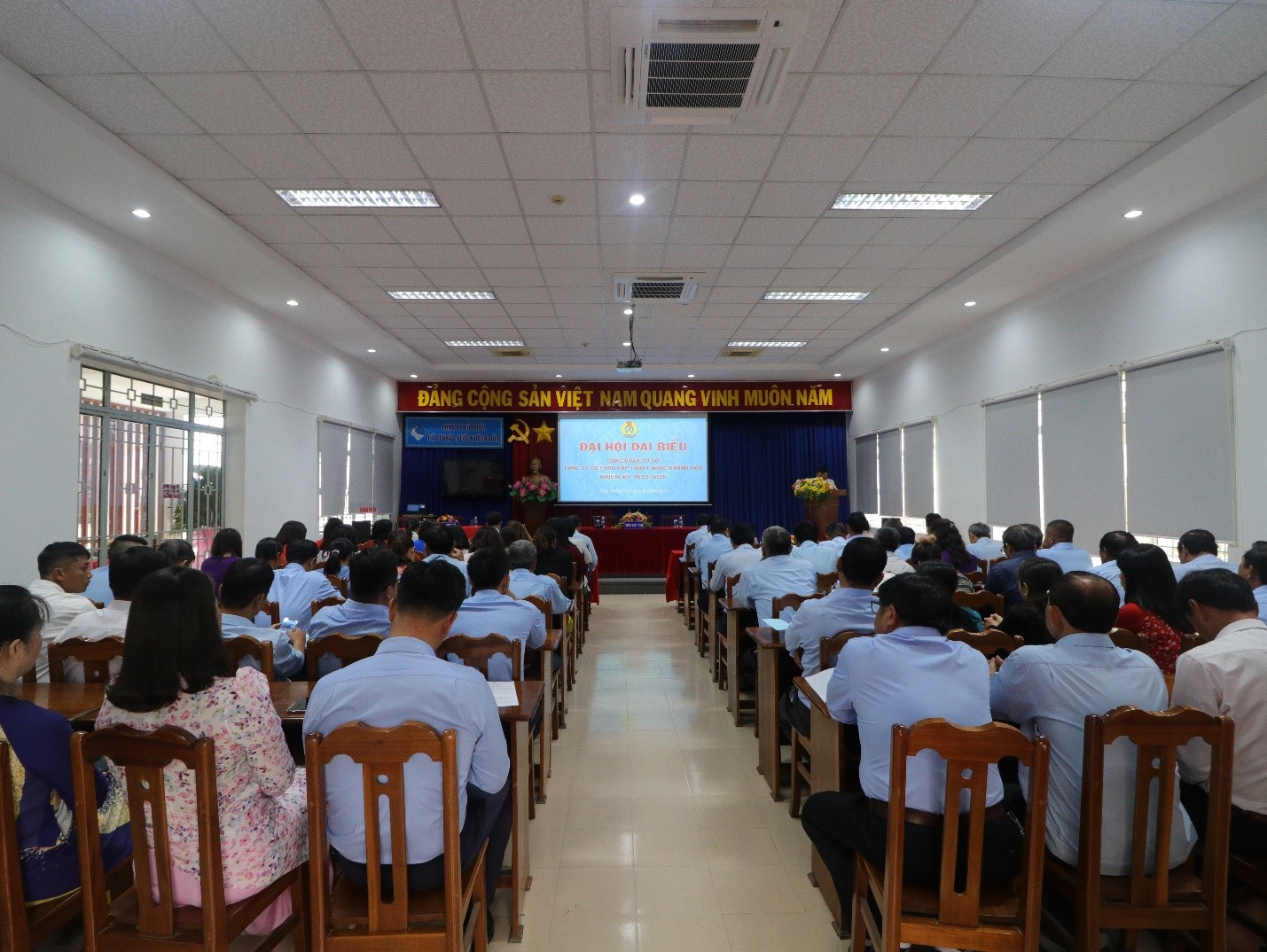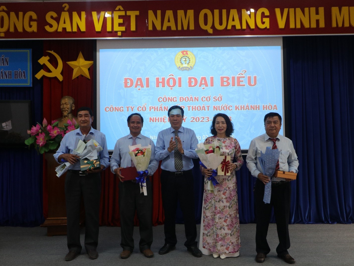 Sáng ngày 18 tháng 3 năm 2023, tại Hội trường, Công đoàn cơ sở Công ty Cổ phần Cấp thoát nước Khánh Hòa long trọng tổ chức Đại hội Công đoàn cơ sở, nhiệm kỳ 2023 – 2028, với sự tham dự của các đồng chí trong Ban Chấp hành Đảng bộ, Ban điều hành, Ban chấp hành công đoàn cơ sở Công ty. Đặc biệt, có sự tham gia của 94 đại biểu là cán bộ, đoàn viên công đoàn đại diện cho 328 cán bộ, đoàn viên công đoàn đang làm việc tại Công ty Cổ phần Cấp thoát nước Khánh Hòa.