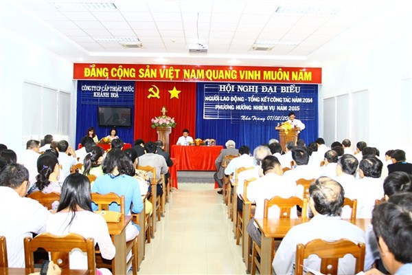 Được sự nhất trí của BCH đảng bộ cơ sở công ty Cổ phần Cấp thoát nước Khánh Hòa, sáng ngày 07/02/2015 tại trụ sở công ty số 58 Yersin – Nha Trang, Hội nghị đại biểu người lao động - lễ tổng kết công tác năm 2014 và bàn phương hướng nhiệm vụ năm 2015 đã diễn ra trọng thể. Tham dự Hội nghị có 102 đại biểu đại diện cho 321 cán bộ công nhân viên công ty và các đại biểu cấp trên thuộc sở Xây dựng Khánh Hòa và sở Nội vụ Khánh Hòa..