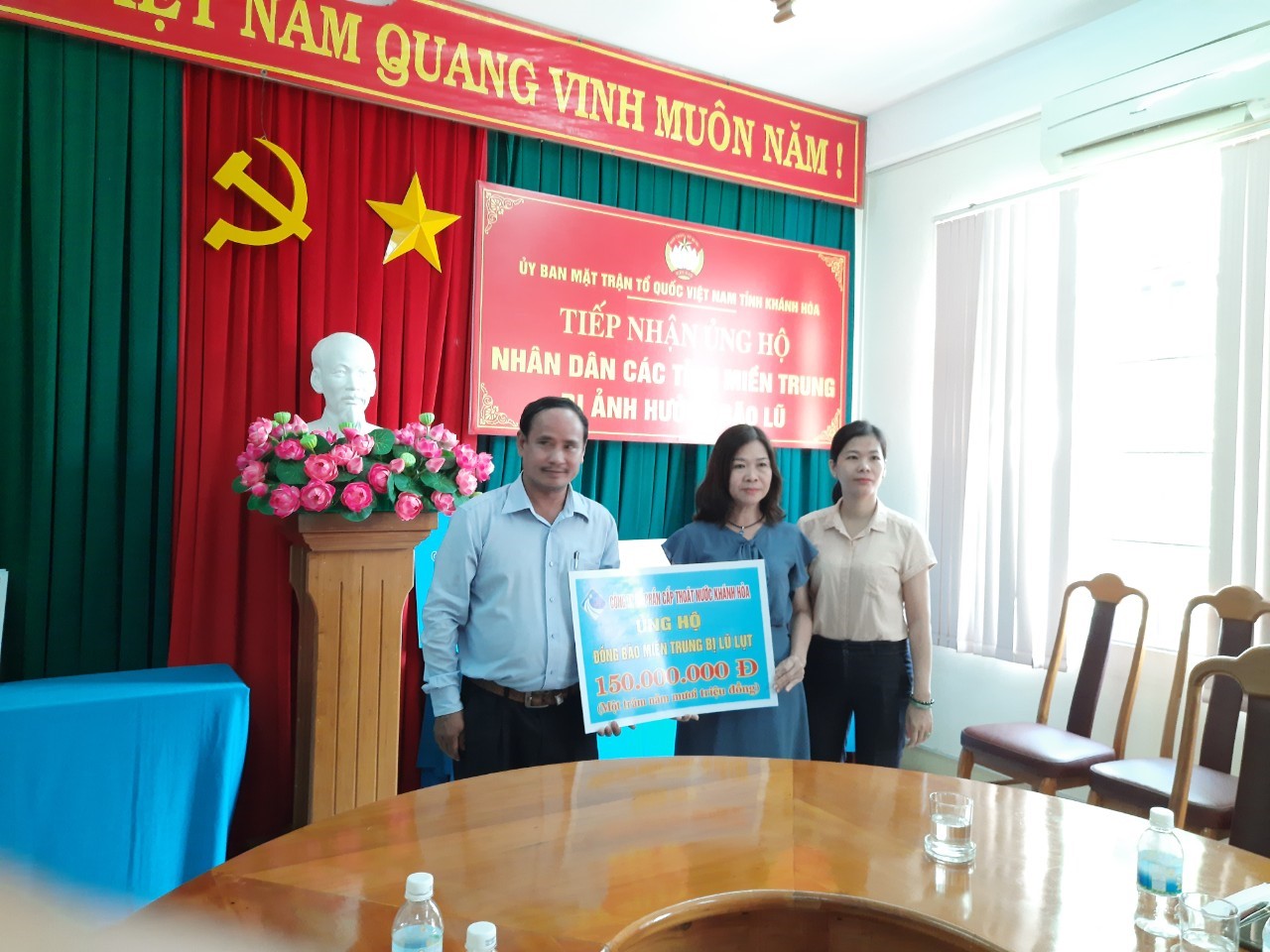 Thời gian qua, các tỉnh miền Trung phải gánh chịu nhiều đau thương, mất mát, tổn thất nặng nề do bão lũ liên tiếp. Hưởng ứng lời kêu gọi của Tổng Bí thư, Chủ tịch nước, Đoàn Chủ tịch Trung ương Mặt trận Tổ quốc Việt Nam, Ủy ban Mặt trận Tổ Quốc Việt nam tỉnh Khánh Hòa về việc hỗ trợ các tỉnh miền Trung bị thiệt hại do lũ lụt. Phát huy truyền thống đoàn kết, tinh thần “tương thân tương ái”, Đảng ủy, Ban Tổng Giám đốc, Ban Chấp hành Công đoàn cơ sở Công ty Cổ phần Cấp thoát nước Khánh Hòa đã kêu gọi toàn thể CBNV công ty cùng chung tay quyên góp, ủng hộ, góp phần giúp nhân dân vùng bị bão lũ, thiên tai nhanh chóng khôi phục sản xuất và ổn định đời sống. Đại diện lãnh đạo công ty đã trao số tiền quyên góp được (150 triệu đồng) cho Ủy ban Mặt trận Tổ quốc Việt Nam tỉnh Khánh Hòa để gửi đến các tỉnh miền Trung bị thiệt hại.