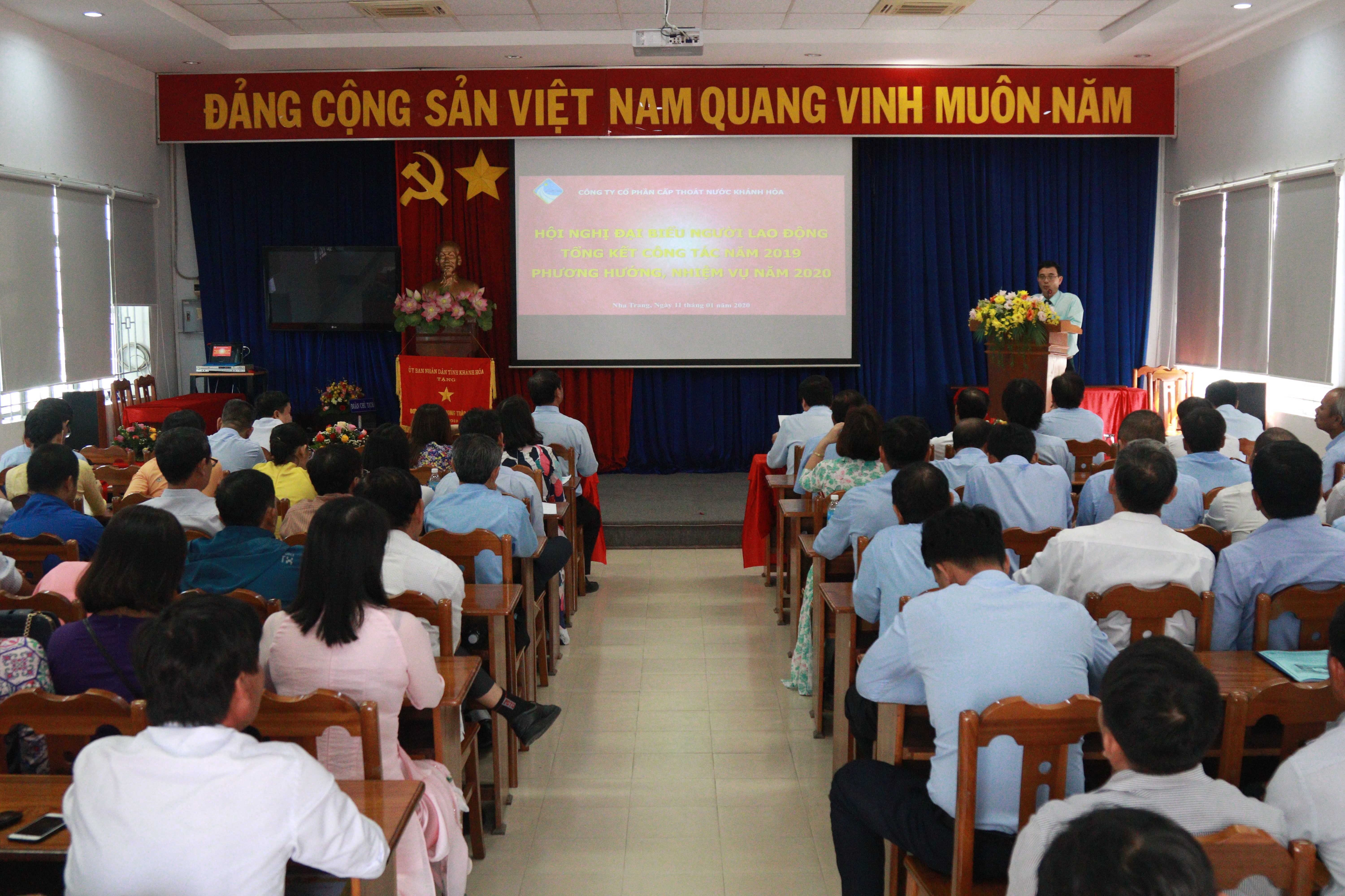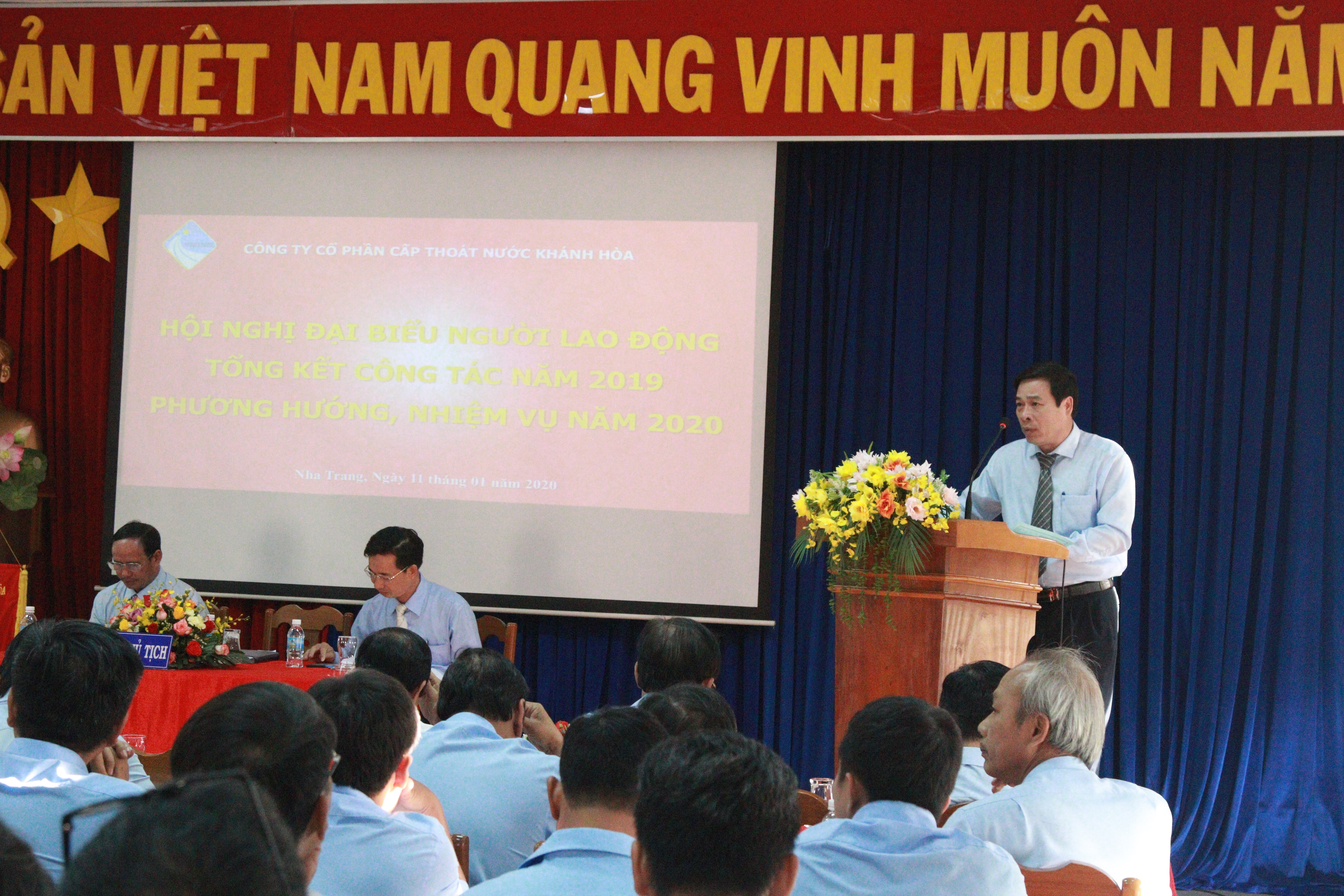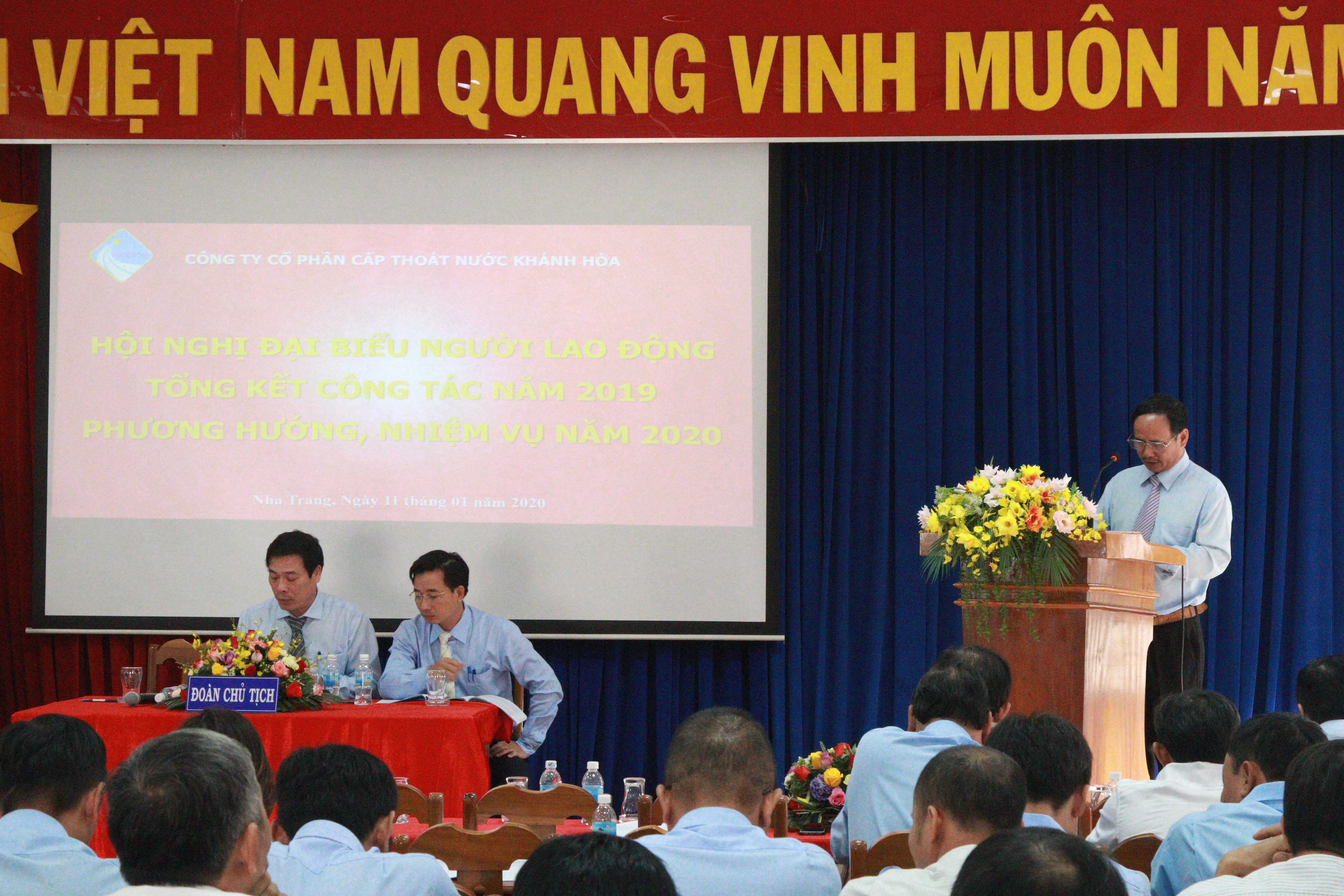 Ngày 11/01/2020, Công ty Cổ phần Cấp thoát nước Khánh Hòa (KHAWASSCO) tổ chức Hội nghị tổng kết công tác năm 2019, triển khai nhiệm vụ năm 2020. Đến tham dự Hội nghị có ông Văn Ngọc Sen – Phó trưởng ban thi đua khen thưởng tỉnh Khánh Hòa – Phó Giám đốc Sở Nội vụ; ông Bùi Đăng Thành – Trưởng ban Chính sách pháp luật – Liên đoàn Lao động tỉnh Khánh Hòa và 90 đại biểu là cán bộ lãnh đạo, quản lý và người lao động tiêu biểu đại diện cho 331 lao động Công ty Cổ phần Cấp thoát nước Khánh Hòa.