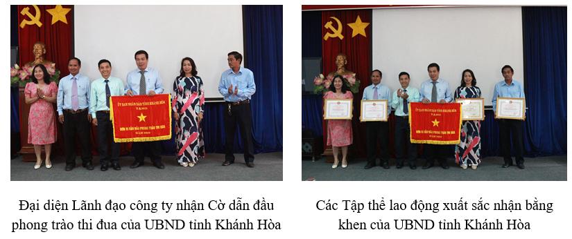 Nhân dịp này, Công ty cũng vinh dự được nhận Cờ đơn vị dẫn đầu thi đua ngành Xây dựng năm 2019, các tập thể có nhiều thành tích đóng góp cho sự phát triển của KHAWASSCO được nhận bằng khen của UBND tỉnh Khánh Hòa.