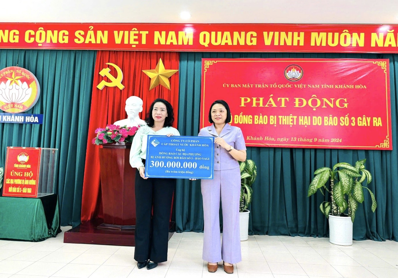 Những ngày qua, cơn bão số 3 (bão Yagi) và hoàn lưu sau bão đã tàn phá, gây thiệt hại nghiêm trọng cho các tỉnh thành phía Bắc. Hưởng ứng lời kêu gọi của đồng chí Tổng Bí thư, Chủ tịch nước, Mặt trận Tổ quốc Việt Nam về vận động ủng hộ đồng bào khắc phục thiệt hại do cơn bão số 3 gây ra. Phát huy truyền thống đoàn kết, tinh thần “tương thân tương ái”, Đảng ủy, Ban Tổng Giám đốc, Ban Chấp hành Công đoàn cơ sở Công ty Cổ phần Cấp thoát nước Khánh Hòa đã kêu gọi toàn thể CBNV công ty cùng chung tay quyên góp, ủng hộ, góp phần giúp nhân dân vùng bị bão lũ, thiên tai nhanh chóng khôi phục sản xuất và ổn định đời sống. Đại diện lãnh đạo công ty đã trao số tiền quyên góp được (300 triệu đồng) đến Ủy ban Mặt trận Tổ quốc Việt Nam tỉnh Khánh Hòa để gửi đến các tỉnh miền Bắc bị thiệt hại.