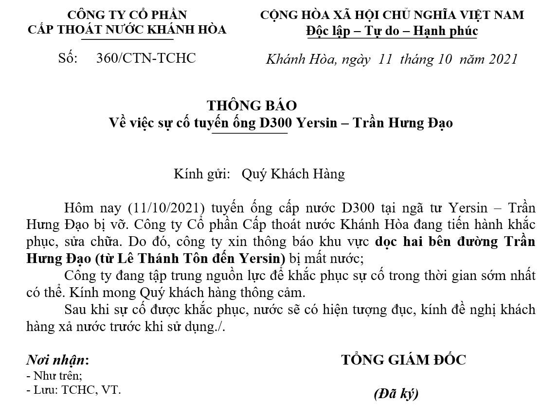 📄 Thông báo Về sự cố tuyến ống D300 Yersin – Trần Hưng Đạo