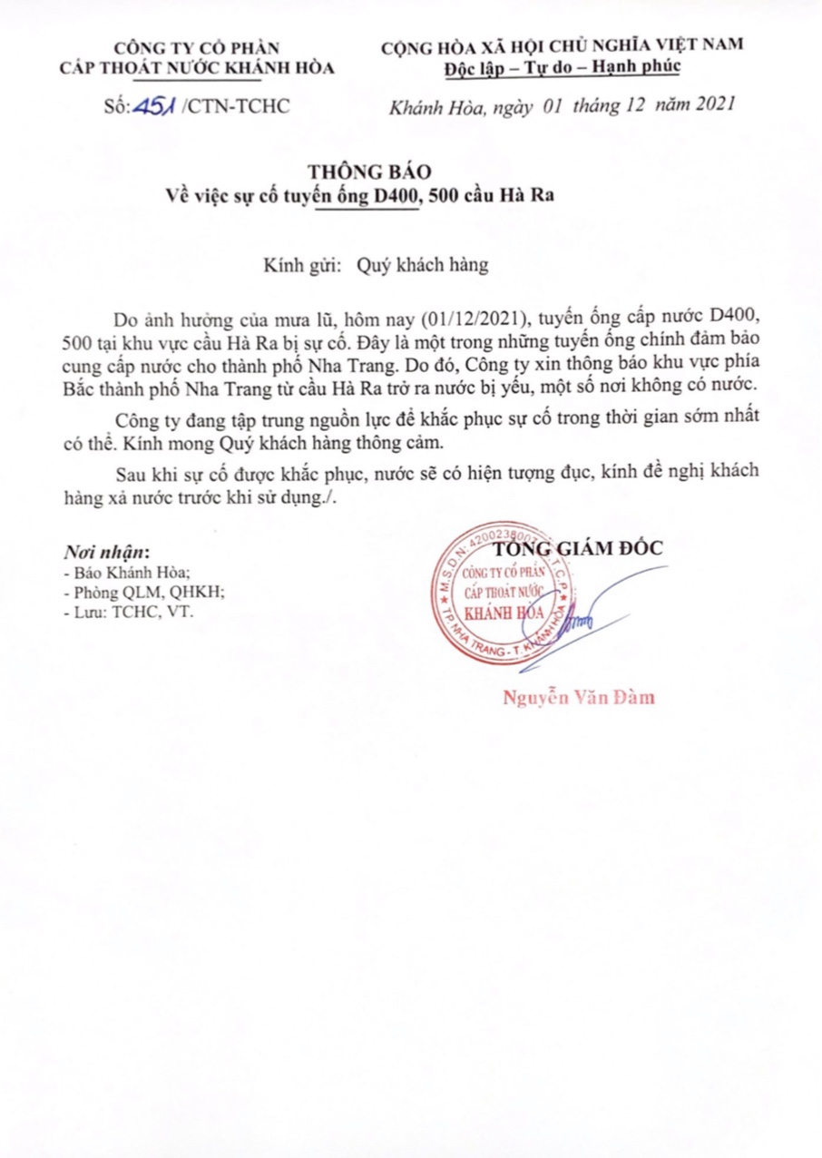 📄 Thông báo về sự cố tuyến ống nước D400, D500 Cầu Hà Ra