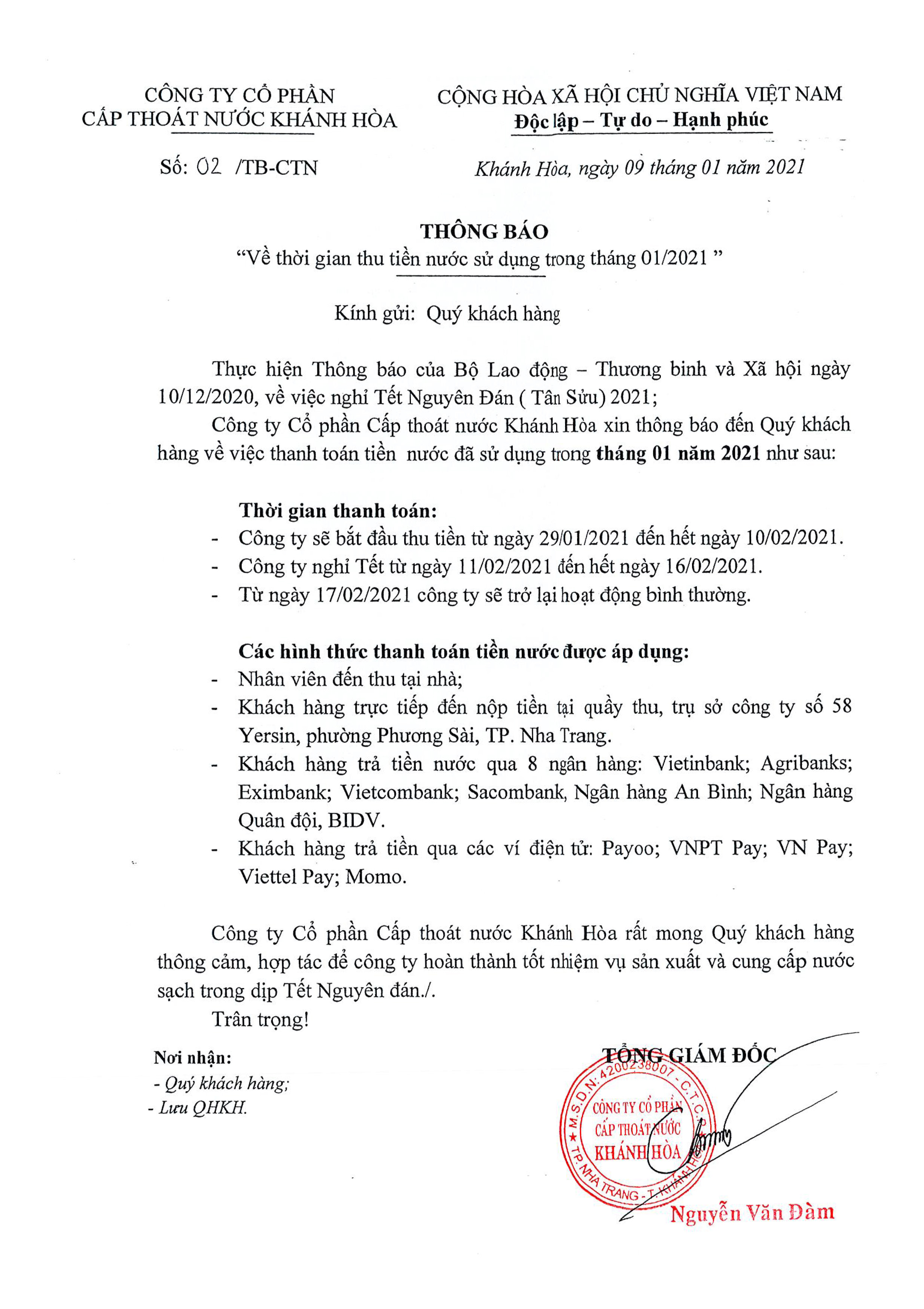 📄 Thông báo về thời gian thu tiền nước sử dụng trong tháng 01/2021