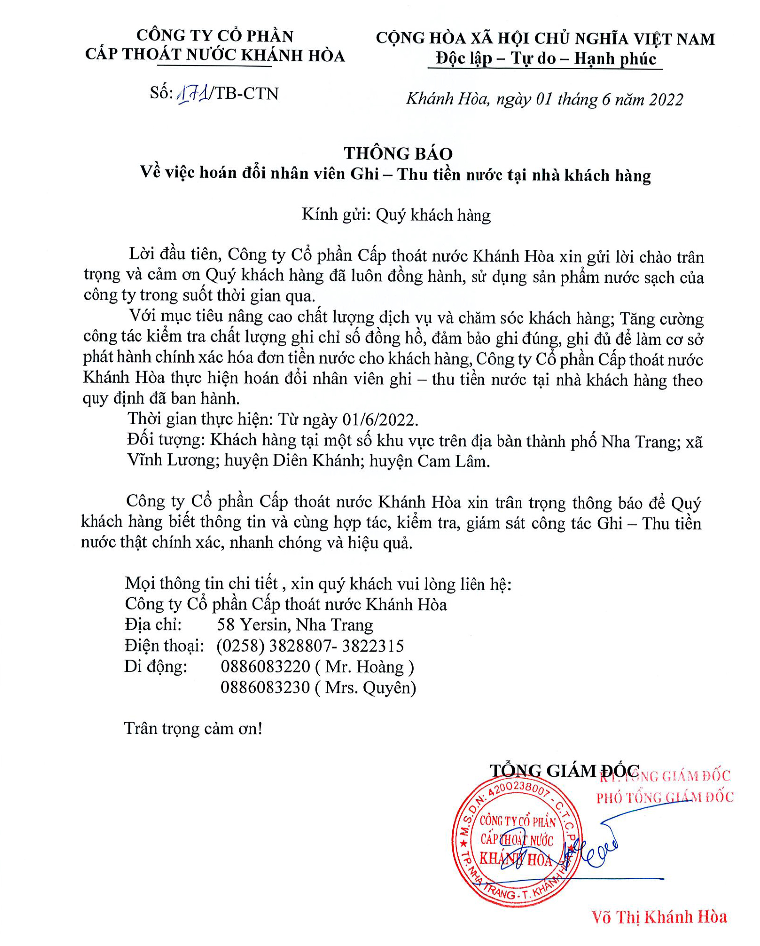 CÔNG TY CỔ PHẦN CẤP THOÁT NƯỚC KHÁNH HÒA